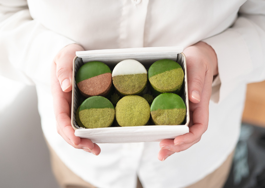 - ・ホワイトチョコレートを使用した商品につきましては、保管環境の温度差や配送時の温度変化により、チョコレート表面に含まれる抹茶が色移りし、薄い緑色になる場合がございます。 こちらは原材料由来の自然な変化であり、品質や安全性にはまったく問題ございません。 同じロット内でも個体差がございますが、当ブランドの正規品として安心してお召し上がりいただけますと幸いです。