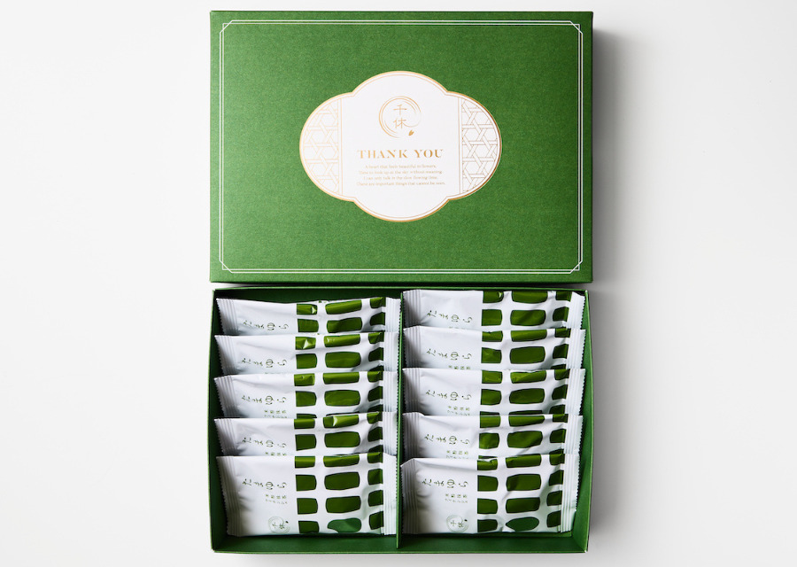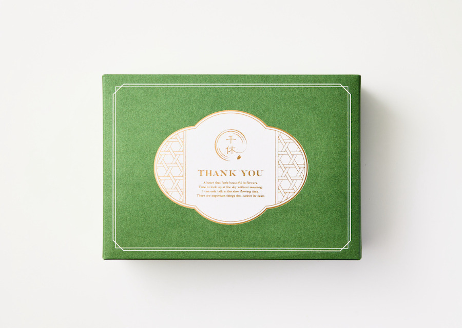 抹茶の深みを演出した抹茶色の箱に、金色の箔押しをあしらいました。