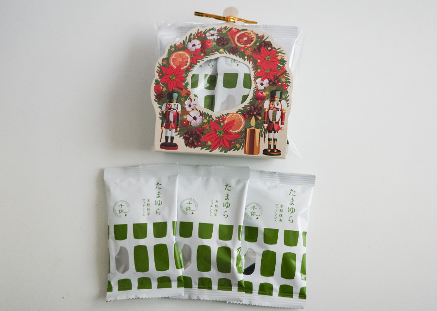 クリスマスに贈る、千休の看板商品「米粉の抹茶フィナンシェ」の3個セット。 京都府産の宇治抹茶をふんだんに使用したフィナンシェは、抹茶の旨味と香ばしいバターの香りが広がります。きっと思い出に残るひと時をお過ごしいただけることまちがいなし。 クリスマスリース形をした可愛らしいパッケージでラッピングした3個入りの抹茶フィナンシェでお届けします。 クリスマスギフトとして「Thank you」の気持ちを、大切な人に送りませんか?
