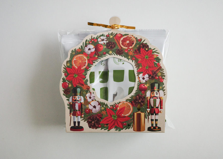 抹茶フィナンシェ3個セットのラッピングには、クリスマスを感じる華やかで可愛らしいクリスマスリースを。日頃の感謝を込めて「Thank you(=千休)」を贈ってみませんか?